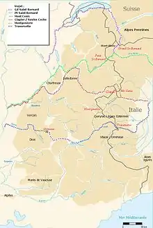 Theodore Ayrault Dodge, escribiendo a fines del siglo XIX, sostuvo que Aníbal usaba el Paso del Pequeño San Bernardo, pero el historiador moderno John Francis Lazenby concluyó que el .Col de Clapier era el paso usado por Aníbal.[80] Más recientemente, W. C. Mahaney ha argumentado que el .Col de la Traversette se ajusta más a los registros de los autores antiguos.[81] Los datos arqueológicos bioestratigráficos han reforzado el caso del Col de la Traversette; el análisis de las turberas cercanas a los cursos de agua a ambos lados de la cima del paso mostró que el suelo estaba fuertemente perturbado "por miles, quizás decenas de miles, de animales y humanos" y que el suelo presentaba rastros de niveles únicos de bacterias Clostridia asociadas al tracto digestivo de caballos y mulas.[82] Fechado por radiocarbono fechas aseguradas de 2168BP o c.218BC, el año de la marcha de Aníbal. Mahaney et al. han concluido que esta y otras evidencias apoyan fuertemente al Col de la Traversette como la 'Ruta de Aníbal' como había sido argumentado por Gavin de Beer en 1974. De Beer fue uno de los tres únicos intérpretes, los otros son John Lazenby y Jakob Seibert de. - haber visitado todos los pasos altos de los Alpes y haber presentado una visión de lo que era más plausible. Tanto De Beer como Siebert habían seleccionado el Col de la Traversette como el que más se acercaba a las descripciones antiguas.[83] Polibio escribió que Hannibal había cruzado el más alto de los pasos alpinos: El paso más alto es el Col de la Traversette, entre el valle del alto Guil y el alto río Po. Es además el más meridional, como relata Varro en su De re rustica, coincidiendo en que el paso de Aníbal era el más alto de los Alpes occidentales y el más meridional. Mahaney et al. argumentan que los factores utilizados por De Beer para apoyar al Col de la Traversette, incluyendo "comparando los antiguos nombres de lugares con el moderno y cercano escrutinio de las épocas de inundaciones en los principales ríos y la visión lejana de las llanuras del Po" junto con "el radiocarbono masivo y la evidencia microbiológica y parasitaria" de los sedimentos aluviales a ambos lados del paso proporcionan "evidencia de apoyo, prueba si se quiere" de que la invasión de Aníbal fue en esa dirección.[84]
