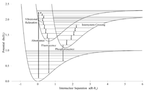 Cuando un estado singlete pasa en forma no radiativa a un estado triplete, o a la inversa, de un estado triplete a un singlete, este proceso se denominia cruce intersistema. En esencia, el espín del electrón excitado se invierte. La probabilidad de que ocurra este proceso es más probable cuando los niveles vibracionales de dos estados excitados se solapan, ya que de esta forma se produce una ganancia o pérdida de energía muy pequeña, o directamente nula, durante la transición. Ya que las interacciones espín/orbital son sustanciales y un cambio en el espín es menos favorable, los cruces intersistema son más comunes en moléculas con átomos pesados (por ejemplo en aquellas que contienen yodo o bromo). Este proceso se denomina acoplamiento espín-órbita. En pocas palabras, implica el acoplamiento del espín electrónico con el momento angular orbital de las órbitas no circulares. Adicionalmente, la presencia de especies paramagnéticas en la solución potencian los cruces intersistema.[2]