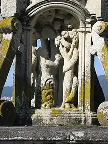 En la base del crucero, a modo de capillita, se abren cuatro hornacinas. En la primera, aparecen representadas las «almas del purgatorio», o almiñas, pidiendo a la Virgen su intersección (para algunos es la Virgen del Carmen; una de esas almas, que pide ayuda para salir del purgatorio, está tocada con una mitra de obispo. En la segunda hornacina, aparece Cristo resucitado en el limbo de los justos (otros creen ver a Cristo sacando las almas del infierno o, también, a la Virgen con Jesús). Finalmente, en las otras dos hornacinas, cada uno en una, Adán y Eva en el Paraíso al pie de un manzano, con el demonio en forma de serpiente tentando a Eva y reptando por el tronco; ambos, Adán y Eva, tienen la mitad inferior del cuerpo tapada por lo que parecen ser lapas, en alusión a las consecuencias del pecado original; otra posible interpretación es que las imágenes recojan el momento de cometer el pecado original y que lo que les cubra sea la vegetación, en un intento ingenuo de ocultar los órganos sexuales a la vista de los fieles.