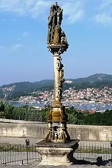 En el fuste, de sección circular, hay tres escenas. La superior son dos ancángeles, uno de ellos pisando la cabeza de una serpiente y el otro parece que está acogiendo a un niño o protegiendo un alma. Debajo de ellos, la Virgen está pisando a un dragón o a una serpiente, símbolos clásicos del demonio, representado la salvación; la serpiente se protege con una media luna. Finalmente, bajo la Virgen, aparecen las figuras de Adán y Eva expulsados del Paraíso, desnudos y tapándose, avergonzados de su pecado.