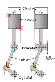 En la mayoría de motores de combustión interna alternativos, la biela conecta directamente el pistón con el cigüeñal. Pero esto transmite fuerzas transversales al pistón, ya que la muñequilla del cigüeñal (y así la dirección donde se aplica la fuerza) se mueve de lado a lado con el movimiento giratorio de la manivela. Estas fuerzas transversales son tolerables en un motor pequeño, pero en motores más grandes esta fuerzas mucho mayores causaría un grado intolerable de desgaste del pistón y el cilindro (véase : ley cuadrático-cúbica), así como aumentando la fricción total en el motor.