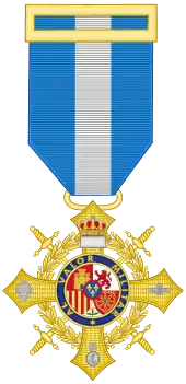 Cruz de plata oxidada, con filete de oro y brazos iguales; en el centro, corona también de oro y cuatro espadas del mismo metal cruzadas, sólo visibles los puños de ellas en los ángulos de la cruz; por medio de una anilla dorada penderá de una cinta azul celeste, con lista blanca en el centro, de una cuarta parte de anchura del total y pasada por una hebilla de oro de tipo corriente.