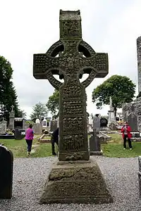 Las cruces monumentales irlandesas están reconocidas internacionalmente como iconos de la Irlanda altomedieval. Se encuentran habitualmente en antiguos lugares con iglesias y pueden ser lisas o decoradas. Las cruces monumentales sirvieron para una variedad de funciones incluyendo usos litúrgicos, ceremoniales y simbólicos. También eran señales para una zona de santuario alrededor de una iglesia; así como puntos focales para mercados, que crecieron alrededor de los lugares donde estaban las iglesias.[1] Las "más grandes",[1] o "clásicas",[2] de las cruces monumentales irlandesas se puede encontrar en abadía de Durrow, la abadía de Kells, y en Monasterboice. Estas cruces monumentales están decoradas con paneles grabados con temas bíblicos; y se cree que fueron influidos por la antigüedad tardía y la Roma altomedieval. Tales cruces monumentales «clásicas» comprenden el mayor conjunto de escultura bíblica de toda Europa, en el último cuarto del primer milenio d. C. Los paneles esculpidos se cree que originariamente estuvieron pintados, aunque no hay restos de pintura hoy.[2] Sobre tales cruces monumentales, la cara oriental tiende a mostrar escenas del Antiguo Testamento y del Apocalipsis; mientras que la occidental muestra escenas del Nuevo Testamento. Las cruces monumentales pueden datarse a partir de las inscripciones que tienen; y es difícil datar la mayoría de las que están lisas y sin decorar. La más antigua de las cruces monumentales irlandesas, en Kinnity, condado de Offaly, ha sido datada en 846–862 d. C. Tanto la cruz de Muiredach como la Cruz de las Escrituras en Clonmacnoise han sido datadas hacia alrededor de 900–920.[1] Las cruces monumentales se cree que se originaron como versiones en piedra de cruces en madera o metal; y las cruces de piedra que han llegado a la actualidad se considera que son la última fase de desarrollo de la cruz monumental. Se cree que hubo formas tempranas realizadas en madera, con paneles ornamentales de chapa de bronce; ya habrían sido mucho más pequeñas que las grandes cruces monumentales que hoy sobreviven. Se considera que las cruces monumentales irlandesas derivan de cruces de piedra en la isla de Gran Bretaña, donde se hicieron populares en el siglo VIII.[3]