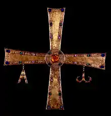 Es una pieza de orfebrería mozárabe con forma de cruz griega, equilátera (49 x 49 cm x 0,4 cm de grosor), realizada en un material no noble, azófar u oricalco; es decir: latón. Los chatones [2] de pedrería que la adornan, treinta en total, son de poco valor y no tienen carácter simbólico. Fueron añadidos posteriormente, al igual las letras alpha y omega que cuelgan de los brazos horizontales; si bien estas pudieron complementarla inicialmente y remitir al Apocalipsis de san Juan cuyo comentario iluminado, que tan amplia difusión tuvo en esa época, los conocidos Beatos, reproducen la imagen de este tipo de cruz en nueve de los ejemplares conservados.