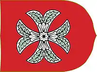 Cruz visigoda de plata, de ocho cabos, fileteada de gules y diapedrada en sinople, cargada con cruz de plata de cuatro cabos iguales rematados en tres salientes trebolados, el central más alto, fileteado de gules y cargada en abismo con florón de plata fileteado de gules.