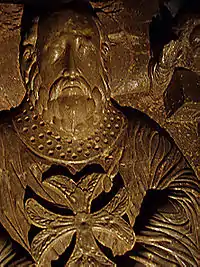 Esta cruz está tomada de la estatua yacente de San Millán, en el cenotafio del s. XII del Monasterio de San Millán de Suso. Es una obra románica de excepcional valor. El santo está revestido de pontifical llevando esta cruz en la casulla.