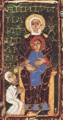 El esmalte de la donante tiene un tamaño de 6 x 2,9 cm. Su icónica Sedes sapientiae («Trono de la sabiduría») muestra a una Virgen entronizada en vista frontal a la derecha, sosteniendo al Niño sobre la rodilla izquierda, en frente de una figura vestida en las ropas blancas de una figura monástica. La monja sostiene una cruz con ambas manos, que ofrece al niño Jesús. El Niño estira ambas manos hacia la cruz en un gesto de aceptación. Una inscripción MA/HTH/ILD / AB/BH/II hace posible identificar a esta monja como la abadesa Matilde. La inscripción es probablemente errónea, con la segunda palabra para que se lea como ABBATI(SSA).[8] Por encima y a la derecha de la Virgen hay otras dos inscripciones, que son incomprensibles. Se tiene la hipótesis de que son versiones mutiladas de inscripciones griegas. La epigrafista Sonja Hermann sugiere que el esmaltador confundió las letras tercera y cuarta y ha invertido una Τ, lo que supondría ΜΗΤΗΡ (μήτηρ - «madre»). Hermann leería los símbolos a la derecha, que están colocados verticalmente, como ΙΥ ΧΥ como en abreviatura de Ι(ησο)ύ Χ(ριστο)ύ («de Jesucristo»).[9]