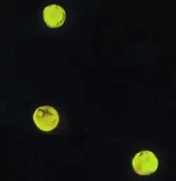 ![]() Imagen por inmunofluorescencia de oocitos de C. parvum | ||
