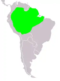 Vive en bosques tropicales de tierras bajas o bosques pantanosos, hasta los 700 m. de altitud.[1] Prefieren vivir cerca de los arroyos. Su hábitat preferido es espeso, oscuro y denso. Esta especie es nativa del sur de Colombia, el sur de Venezuela, Surinam, Guyana, Guayana Francesa, el norte y el oeste de Brasil, este de Ecuador, este de Perú, y el norte de Bolivia[4]