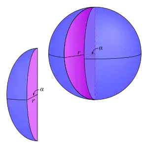 En geometría, una cuña esférica es una porción de una bola limitada por dos discos planos y una luna esférica (denominada la base de la cuña). El ángulo entre los radios que se encuentran dentro de los semidiscos delimitadores es el ángulo diedro de la cuña α. Si AB es un semidisco que forma una bola cuando gira completamente sobre el eje z, cuando se gira AB solo un ángulo α dado produce una cuña esférica del mismo ángulo α.[1] Beman (2008)[2] señala que "una cuña esférica es a la esfera de la cual es parte como el ángulo de la cuña es a un perigono".[nota 1] Una cuña esférica de α = Π radianes (180°) se denomina semiesfera, mientras que una cuña esférica de α = 2Π radianes (360°) constituye una bola completa.