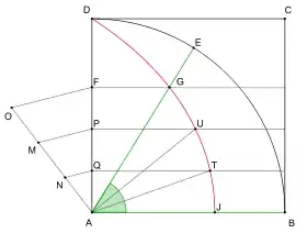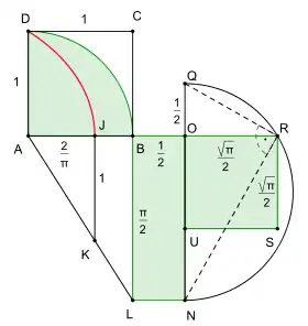 Según el teorema de Dinóstrato, la cuadratriz divide uno de los lados del cuadrado asociado en una proporción de .[1] Para un cuarto de círculo dado con radio r se construye el cuadrado asociado ABCD con longitud de lado r. La cuadratriz se cruza con el lado AB en J con . Ahora se construye un segmento de línea JK de longitud r que es perpendicular a AB. Entonces, la línea a través de A y K interseca la extensión del lado BC en L; y según el teorema de Tales se deduce que . Extendiendo AB a la derecha por un nuevo segmento, produce el rectángulo BLNO con los lados BL y BO, cuya área coincide con el área del cuarto de círculo. Este rectángulo se puede transformar en un cuadrado de la misma área con la ayuda del teorema de la media geométrica. Ahora, se extiende el lado ON mediante un segmento y se dibuja un semicírculo a la derecha de NQ, que tiene NQ como diámetro. La extensión de BO se encuentra con el semicírculo en R y debido al teorema de Tales, el segmento OR es la altura del triángulo rectángulo QNR. Por lo tanto, se puede aplicar el teorema de la media geométrica, lo que significa que OR forma el lado de un cuadrado OUSR con la misma área que el rectángulo BLNO, y por lo tanto, con la misma área que el cuarto de círculo.[7]
