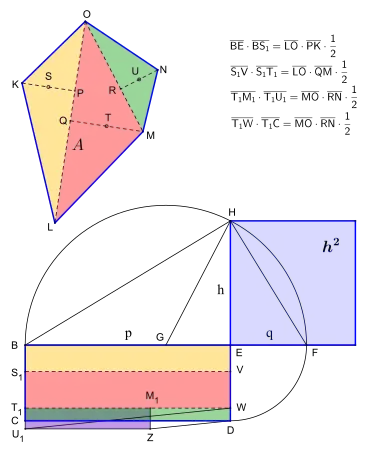 De la fórmula para determinar el triángulo amarillo , a corresponde a la diagonal LO y h a la línea recta PK, el área rectangular amarilla se puede determinar y utilizado F=BE·BS1. En consecuencia, esto también se aplica al triángulo rojo LMO y al rectángulo rojo T1WVS1.
