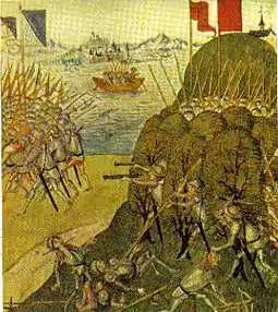 Durante el siglo XV la infantería suiza estaba organizada según el principio de las falanges macedonias, cuadros de infantes muy próximos entre sí armados con picas de 5 o más metros que contienen y ensartan a la caballería, desordenándola y frenándola. Estas formaciones permitían a las tropas de la Confederación suiza enfrentarse a ejércitos numéricamente superiores y salir victoriosas.