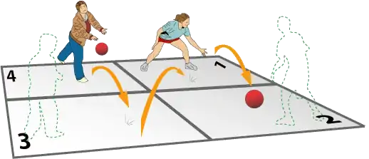 El jugador en la cuarta casilla empieza el turno por servir el balón. El deja caer el balón en su propia casilla, luego lo golpea, conforme a los reglamentos, para la primera casilla. Cada jugador en turno lo dejan tocar el suelo de su casilla, luego lo golpean para una otra casilla de su gusto, hasta algún jugador haga un error y esté eliminado.
