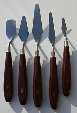 - Cuchillo de paleta parecido a un cuchillo de masilla con una punta redondeada, ideal para la mezcla de pinturas en la paleta;