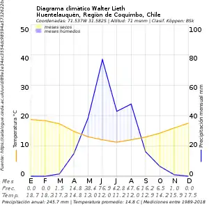 De acuerdo con los datos recopilados por la Universidad Técnica de Dresde[3] y según la clasificación climática de Köppen, la localidad de laguna del Pelado, en la alta cordillera (3590 m) de la Región de Coquimbo, posee un clima de tundra, con 276,6 mm de precipitaciones anuales y una temperatura promedio anual de 0,6°C. Las ciudades de Huentelauquén (precipitaciones anuales de 245,7 y temperatura promedio anual de 14,8°C), en la desembocadura de la cuenca, y Salamanca (precipitaciones anuales de 293,5 mm y temperatura promedio anual de 8°C) en el Valle Central, tienen un clima similar llamado clima oceánico templado.