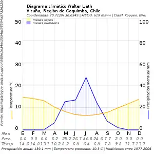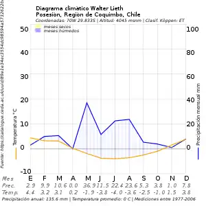 De acuerdo con los datos recopilados por la Universidad Técnica de Dresde[3] y según la clasificación climática de Köppen, la localidad de Posesión, ubicada en la alta cordillera (4000 msnm) de la cuenca donde confluyen el río Vacas Heladas y el río Toro (afluente del río Turbio), tiene un clima de tundra, con 135 mm de precipitaciones anuales y 0°C de temperatura promedio anual. La ciudad de Vicuña tiene un clima árido frío con una temperatura media anual de 10,3°C y precipitaciónes de 139 mm por año. Se puede apreciar en los diagramas que aunque ambas localidades reciben casi iguales precipitaciones, las diferencias de temperatura producen en una un clima árido y en la otra uno más húmedo.