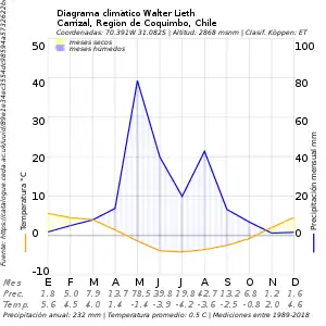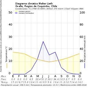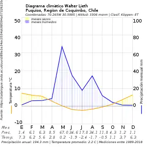 De acuerdo con los datos recopilados por la Universidad Técnica de Dresde[2] y según la clasificación climática de Köppen, las localidades de Puquíos y Carrizal, ubicadas en la alta cordillera a cerca de 3000 msnm, tienen clima de tundra. La ciudad de Ovalle tiene un clima árido frío.