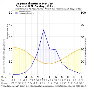 Los climogramas Walter Lieth muestran con un área azul los periodos en que las precipitaciones sobrepasan la cantidad de agua que el calor del sol evapora en el mismo lapso de tiempo, (un promedio de 10°C mensuales evaporan 20 mm de agua caída) dejando un clima húmedo. Por el contrario, las zonas amarillas indican que durante ese tiempo el agua caída puede ser evaporada por el calor del sol.