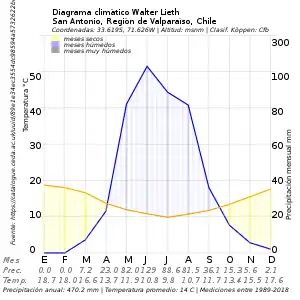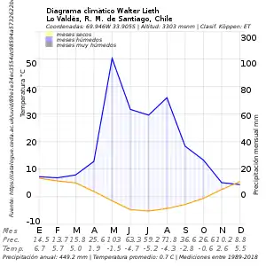 De acuerdo con los datos recopilados por la Universidad de Dresde y según la a clasificación climática de Köppen, la zona cordillerana tiene en Lo Valdés un clima de tundra con temperaturas diarias promedio bajo cero en invierno, la zona del valle central un clima estepario en Pudahuel y un clima oceánico templado en la ciudad y puerto de San Antonio.