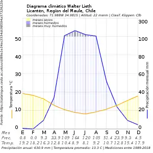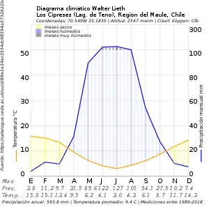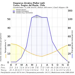 De acuerdo con los datos recopilados por la Universidad Técnica de Dresde[3] y según la clasificación climática de Köppen, las zonas de las lagunas de Teno en la alta cordillera y las ciudades de Curicó, en el Valle Central, así como la ciudad de Licantén en la desembocadura del Matataquito, poseen un clima oceánico templado, con precipitaciones anuales en torno a los 600 mm y temperaturas promedio de 13°C a 14°C en el plano y 9°C en la montaña.