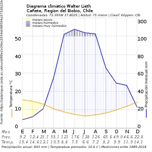 De acuerdo con los datos recopilados por la Universidad Técnica de Dresde[3] y según la clasificación climática de Köppen, la zona de la ciudad de Cañete tiene todas un clima oceánico templado precipitaciones anuales de 840 mm y temperatura promedio anual de 8,3°C.