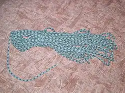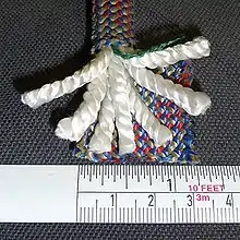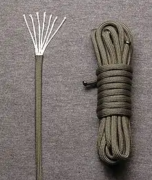 La cuerda de paracaídas es un tipo de cuerda liviana de nylon con núcleo. El núcleo de este tipo particular de ejemplo está formado por siete hebras de dos hilos retorcidos, el forro exterior está tejido con 32 hilos.