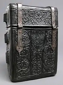 Cuir bouilli O cuir-bouilli (kweer-abucheo-YEE, pronunciación en francés: /kɥiʁ buˈji/: [kɥiʁ buˈji]), significando cuero hervido, pero a menudo dejado en francés, era un material histórico para varios usos comunes en las Edades Medias y Periodo Moderno Temprano. Era cuero que había sido tratado de modo que fuera duro y rígido, así como capaz de tener decoración hecha con moldes. Era el material habitual para el bolsas robustas que llevaban piezas importantes de metal, instrumentos como astrolabios,[1] cubertería, libros, bolígrafos... Fue utilizado para alguna armadura, siendo mucho más barato y ligero que la armadura ligera, pero no podía aguantar un golpe directo de una espada, ni un disparo.