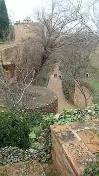 Hasta mediados del siglo XX, no existía conexión directa entre Alhambra y Generalife, por lo que el paso entre ambos lugares se hacía históricamente a través de la Cuesta de los Chinos. Tras dejar a la derecha las basas de la Torre de las Damas del Partal, encontramos un bastión, de época cristiana con una puerta, conocida como Puerta de Hierro. Este bastión y puerta, dan acceso a un recinto de caballerizas y a la llamada Puerta del Arrabal, bajo la Torre de los Picos, que era la salida original de los Palacios hacia el Generalife. En la margen izquierda, y casi a la misma altura, se inicia un callejón entre tapias, cerrado con cancela, que es de origen nazarí y que lleva hasta el mismo Palacio del Generalife, cruzando las huertas. Este camino, se encuentra en muy buen estado de conservación.