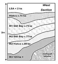 Las excavaciones llevadas a cabo en la cueva de Blombos desde 1991 proporcionan instantáneas de la vida en la edad de piedra media en el cabo sur de Sudáfrica. Se han identificado tres fases de ocupación en ese periodo, identificadas y denominadas como M1, M2 y M3. La datación mediante métodos de luminiscencia ópticamente estimulada y termoluminiscencia han determinado las fechas de ocupación para cada fase, siendo de hace 71 000 años para la fase M1, unos 78 000 años para la fase M2 y entre 100 000 y 140 000 años para la fase M3.[1]
