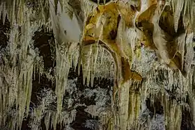El aspecto actual se data en unos 12 millones de años, con formaciones espectaculares en su gran sala de unos 10 000 m², entre ellas numerosas "excéntricas", coladas, estalactitas y cortinas colgantes de múltiples formas, algunas tubulares y estalagmitas constituidas gota a gota desde el suelo.