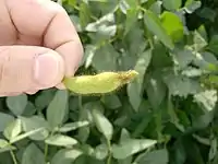 R 3 Comienzo de Fructificación: vainas de 5 mm de largo en alguno de los cuatro nudos superiores del tallo principal con una hoja totalmente desarrollada