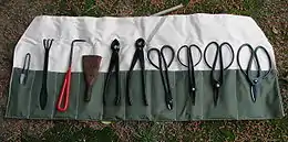 Existen herramientas especiales para el mantenimiento de los bonsái. La herramienta más común es la tijera de podar cóncava (5.ª desde la izquierda en la fotografía), una herramienta diseñada para podar en forma limpia sin dejar rebabas. Otras herramientas comprenden dispositivos para doblar ramas, alicates para alambre y tijeras de diversos tipos para realizar estilizados.