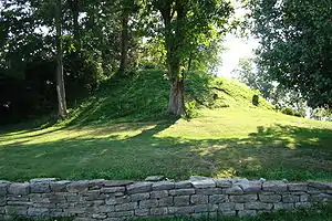 - La tumba de Grave Creek, de 21 m de altura y 90 m de diámetro es el montículo funerario más grande de EE. UU. Se encuentra en el centro de la ciudad de Moundsville (Virginia Occidental), a 300 m del río Ohio. En 1838 se realizó la primera investigación arqueológica conocida cuando varios amateurs no arqueólogos del lugar realizaron dos túneles a través del montículo y encontraron dos tumbas. Más tarde toda la evidencia arqueológica de este montículo fue destruida.[6][7]