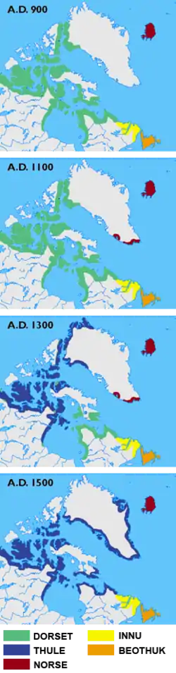 La cultura Dorset se podía dividir en varios periodos: Primitivo, Medio, Tardío y Terminal. La fase Terminal pudo tener lugar cuando los Thule entraban en el ártico canadiense al emigrar desde Alaska. Esta fase final también tuvo lugar cuando el clima se estaba calentando. Con clima más cálido, el mar de hielo era más impredecible y esto aisló el Alto Ártico. Los Dorset seguirían al hielo y concentraron sus asentamientos en el Alto Ártico durante los períodos Tardío y Terminal.