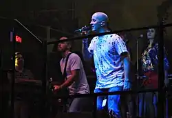 ![]() Willy Rodríguez (en medio con micrófono en mano), vocalista de Cultura Profética en vivo. | ||