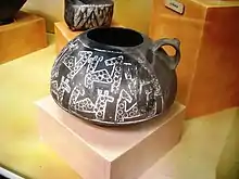 - Tiestos cerámicos con superficie color crema o blanquecina con dibujos geométricos o figuras zoomorfas negras.