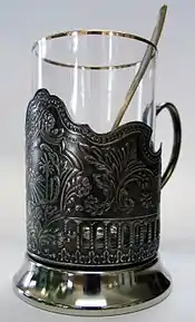 Las formas tradicionales de los utensilios de té rusos incluyen la urna de infusión de té rusa llamada samovar, los juegos de té de Lomonosov adornados con un diseño de red azul cobalto y oro de 22 quilates, y los tradicionales podstakannik, que es un soporte de metal con asa que sirve para sostener el vaso en el que se sirve el té.