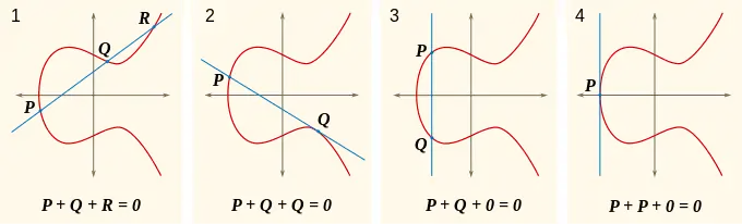 Si xP = xQ, entonces hay dos opciones: si yP = -yQ, entonces la suma se define como 0; así que el inverso de cada punto de la curva se encuentra reflejándolo en el eje x. Si yP = yQ ≠ 0, entonces R = P + P = 2P = (xR, yR) vendrá dado por