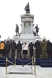 Seguidamente, cerca del mediodía, ocurre la llegada del Presidente de la República a la Plaza Sotomayor, acompañado por el Ministro de Defensa Nacional y el Comandante en Jefe de la Armada. Son recibidos por el Comandante de la Primera Zona Naval. Acto seguido, la comitiva pasa revista a las fuerzas de presentación, a los sones del himno nacional, mientras en el mástil de la plaza se iza la bandera presidencial de Chile. Llegados al monumento, toman colocación para asistir a lo que sigue de la ceremonia oficial.
