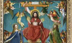 Cristo se sienta en el centro de un gran grupo de ángeles, santos y ancianos patriarcas.[34] Según Pächt, esta escena representa un Cielo en el que «todo es dulzura, gentileza y orden».[35] María y Juan se arrodillan en oración al lado de Cristo, a derecha e izquierda. Ambos tienen nimbos y están realizados en una escala mucho mayor que las imágenes circundantes, sobre las que parecen estar elevadas. María tiene su mano derecha en su pecho, mientras que su izquierda se alza como para pedir la piedad para las pequeñas figuras desnudas protegidas por su capa, evocando la pose convencional de la Virgen de la Misericordia. Un coro de santas vírgenes se reúnen directamente bajo los pies de Cristo. Miran hacia el espectador y cantan el elogio de Cristo.[34]