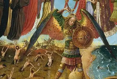El panel derecho, de igual forma que el panel de la Crucifixión, está dividido horizontalmente en tres áreas. Se representan, de arriba abajo, el cielo, la tierra y el infierno. El cielo contiene una déesis tradicional con clérigos y laicos; la tierra, en el piso intermedio, es dominada por las figuras de San Miguel Arcángel y una personificación de la muerte; mientras en el tercio inferior los condenados caen al infierno y son torturados y comidos por bestezuelas. Al describir el pasaje del infierno, el historiador de arte Bryson Burroughs escribe que «las invenciones diabólicas del Bosco y Brueghel son un juego de niños comparadas con los horrores del infierno imaginados por van Eyck».[30][31] Pächt compara la escena con un bestiario medieval, comprendiendo «una fauna total de demonios zoomórficos». El infierno en tinieblas de van Eyck está habitado por monstruos demoníacos de los cuales los únicos rasgos visibles son a menudo «sus ojos que brillan y el blanco de sus colmillos».[9] Los pecadores caen boca abajo a su tormento, a merced de los demonios que toman formas reconocibles como ratas, serpientes y cerdos, así como un oso y un asno.[23] Audazmente, van Eyck muestra reyes y miembros del clero entre los condenados al infierno.[18]