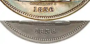 Cuando comenzó la producción a gran escala, el águila del reverso se encontraba rodeada por 26 estrellas en lugar de 24, como Patterson había solicitado originalmente a Sully, porque los estados de Arkansas y Míchigan habían sido admitidos en la Unión después de que se escribió la carta de Patterson, en 1835. Algunos de los dólares de Gobrecht se emitieron con «alineación de medallas», lo que significa que las imágenes del anverso y el reverso miran hacia arriba cuando se gira la moneda alrededor de su eje vertical.[15] Para la producción de 1837 —que mantuvo la fecha de 1836— Patterson ordenó que las monedas se acuñaran en la alineación de las monedas (las dos caras están en posición vertical cuando la moneda es girada sobre su eje horizontal).[15] Una ley del 18 de enero de 1837 cambió oficialmente el estándar legal para las monedas de plata del 89,2 %[16] al 90 % de plata.[17] El historiador numismático Walter Breen afirma que esas piezas acuñadas antes de la aprobación de dicha ley son técnicamente patrones (monedas creadas para probar su diseño, composición u otros puntos), ya que no fueron autorizadas por el Congreso.[18] En total, se acuñaron mil piezas con fecha de 1836, en 89,2 % de plata, y 600 en 90 % de plata.[16] Los dólares de Gobrecht emitidos antes de la aprobación de la ley pesaban 26,96 gramos (0,951 onzas), mientras que los que se acuñaron más adelante pesaron 26,73 gramos (0,943 onzas).[16]