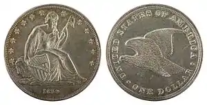 La continua demanda popular por las nuevas monedas llevó a Woodbury a ponerse en contacto con Patterson, solicitando más dólares de plata.[19] En 1838, se modificó el diseño para eliminar las estrellas del reverso.[20] Durante el ciclo de producción, se acuñaron varios patrones de dólares de Gobrecht, que diferían de las emisiones corrientes. Se acuñó un pequeño número con la fecha de 1838 que no llevaba las iniciales de Gobrecht en ningún lugar.[20] En total, se emitieron 300 dólares de este tipo con fecha de 1839 para su circulación, todos con alineación de medallas.[20] La acuñación de ensayo de Patterson evidentemente había sido un éxito, pues la producción a gran escala del dólar Libertad sentada comenzó en 1840.[21] En este dólar se utilizó un diseño de anverso basado en el del dólar de Gobrecht, aunque el reverso se modificó y en lugar de un águila alzando el vuelo se utilizó un águila heráldica.[22]