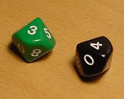 - En un dado de diez caras, la cara inscrita con el 0 suele ser la cara opuesta a la inscrita con el 9.