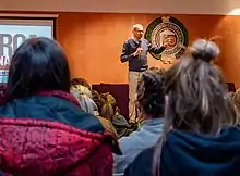 ![]() Colombo brindando una conferencia en la Universidad de Belgrano. | ||