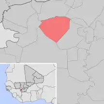 Se encuentra ubicada al suroeste del país y al oeste de la región de Sikasso, a poca distancia del río Níger, de la frontera con República de Guinea y Costa de Marfil y al sur de la capital nacional, Bamako.