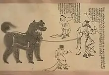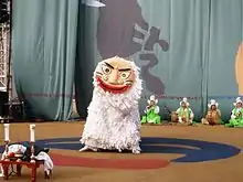 El león japonés consiste en una cabeza de madera lacada llamada shishi-gashira (lit. Lion Head), a menudo con un cuerpo característico de tela teñida de verde con diseños blancos. Puede ser manipulado por una sola persona, o por dos o más personas, una de las cuales manipula la cabeza. La variedad de un solo hombre se ve con mayor frecuencia en el este de Japón.[52] Al igual que con los leones chinos, la marca de la cabeza y los diseños del cuerpo diferirán de una región a otra, e incluso de una escuela a otra. Sin embargo, la máscara a veces puede tener cuernos que parecen ser un ciervo (shika), y shishi escrito con diferentes caracteres kanji puede significar bestia, ciervo o jabalí, por ejemplo, como en shishi-odori (鹿 踊, lit. Deer Dance). Históricamente, la palabra shishi puede referirse a cualquier animal salvaje de cuatro patas, y algunas de estas danzas con diferentes bestias también pueden denominarse shishi-mai.[45] El baile también puede presentar a veces tigres (tora) o qilin (kirin).[53]