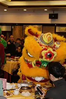 Durante el Año Nuevo chino, las compañías de danza del león visitarán las casas y tiendas de la comunidad asiática para realizar la costumbre tradicional de " cai qing " (採 青), que significa literalmente "desplumar los verdes", por lo que el león arranca la lechuga verde propicia bien colgado en un poste o colocado en una mesa frente al local. Los "greens" (qing) están vinculados con un " sobre rojo " que contiene dinero y también pueden incluir frutas auspiciosas como las naranjas. En chino, cǎi (採, pluck) también suena como cài (菜, que significa vegetal) y cái (财, que significa fortuna). El "león" bailará y se acercará al "verde" y al "sobre rojo" como a un gato curioso, para "comer el verde" y "escupirlo" pero mantener el "sobre rojo", que es la recompensa para la compañía de leones. Se cree que la danza del león trae buena suerte y fortuna al negocio. Durante la Dinastía Qing, puede haber significados ocultos adicionales en las actuaciones, por ejemplo, las verduras verdes (qing) que come el león pueden representar a los Manchúes Qing.[70] En la danza moderna del león de Hok San, usarán uno de los muchos exámenes para acercarse a la comida, cada uno con una secuencia específica de ritmo y movimiento. El león examina la comida moviendo las orejas y pestañeando a la vez.