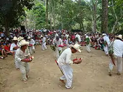 El danzante lleva la procesión de la iglesia a la ermita del patrón. De retorno, a medio camino, se encuentra con el "caballito" y después de escenificar una batalla ambos personajes levan la comida a la iglesia, donde será ofrecida en lengua chontal para después ser compartida con toda la comunidad.[10]